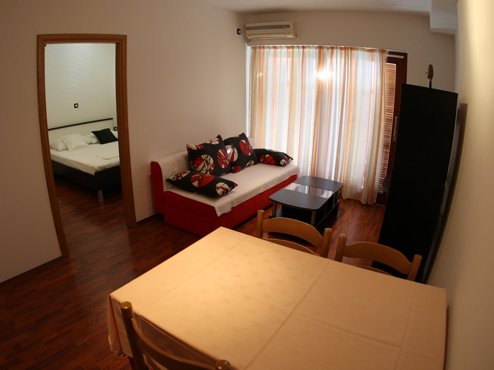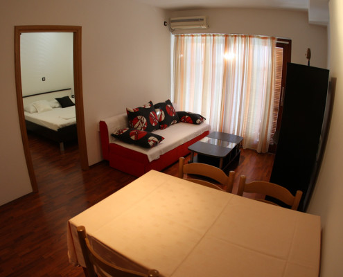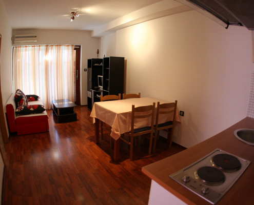 Die Ferienwohnung 5 ist ideal für größere Familien bis zu fünf Mitgliedern. Sie hat zwei Schlafzimmer, eine Küche, ein Wohnzimmer und ein Bad mit Toilette. Vom Balkon aus bietet sich ein wunderschöner Blick aufs Meer.